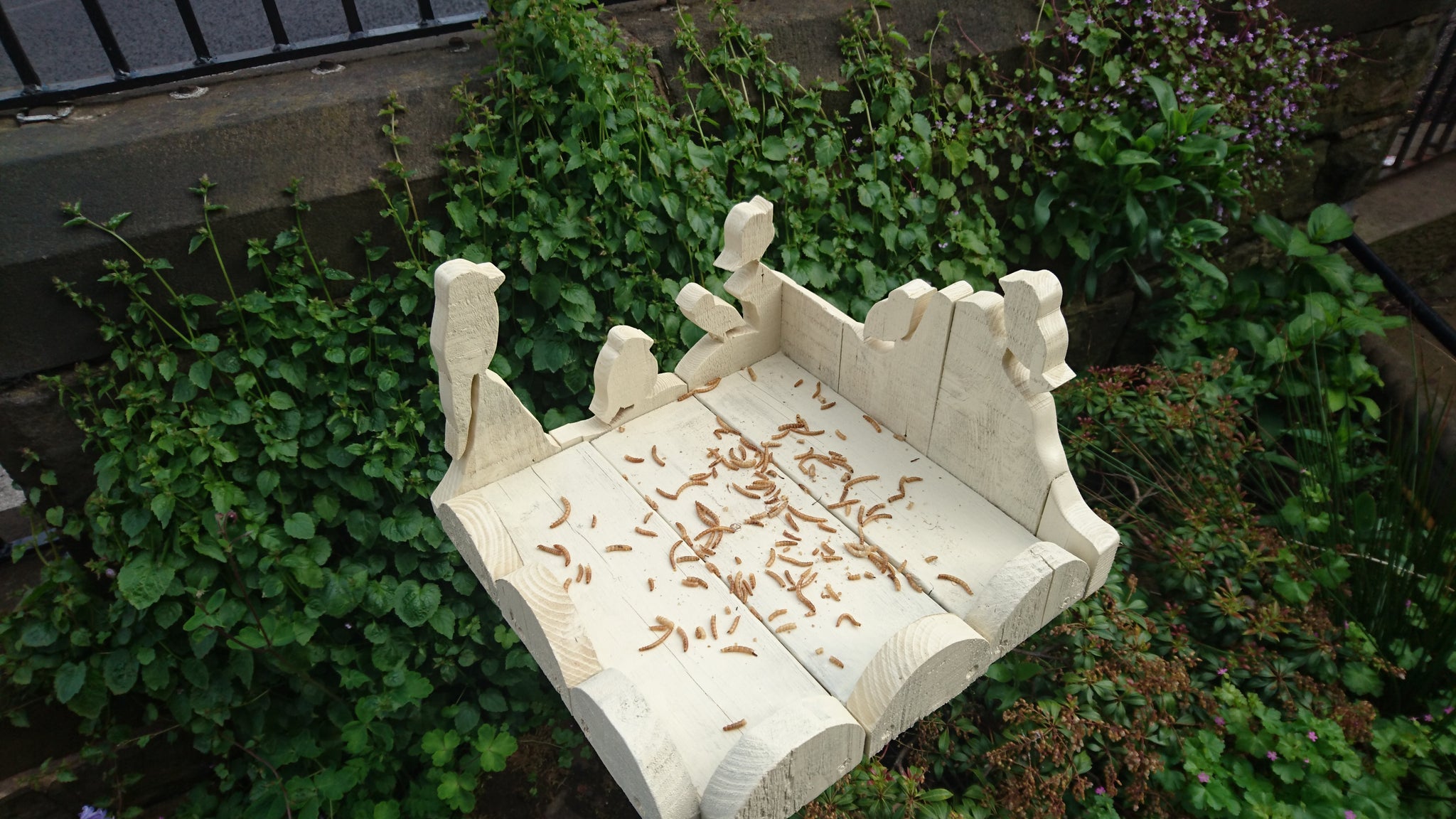 The birdbath was once a fire-pit bowl and the bird table is made from old fencing panels.